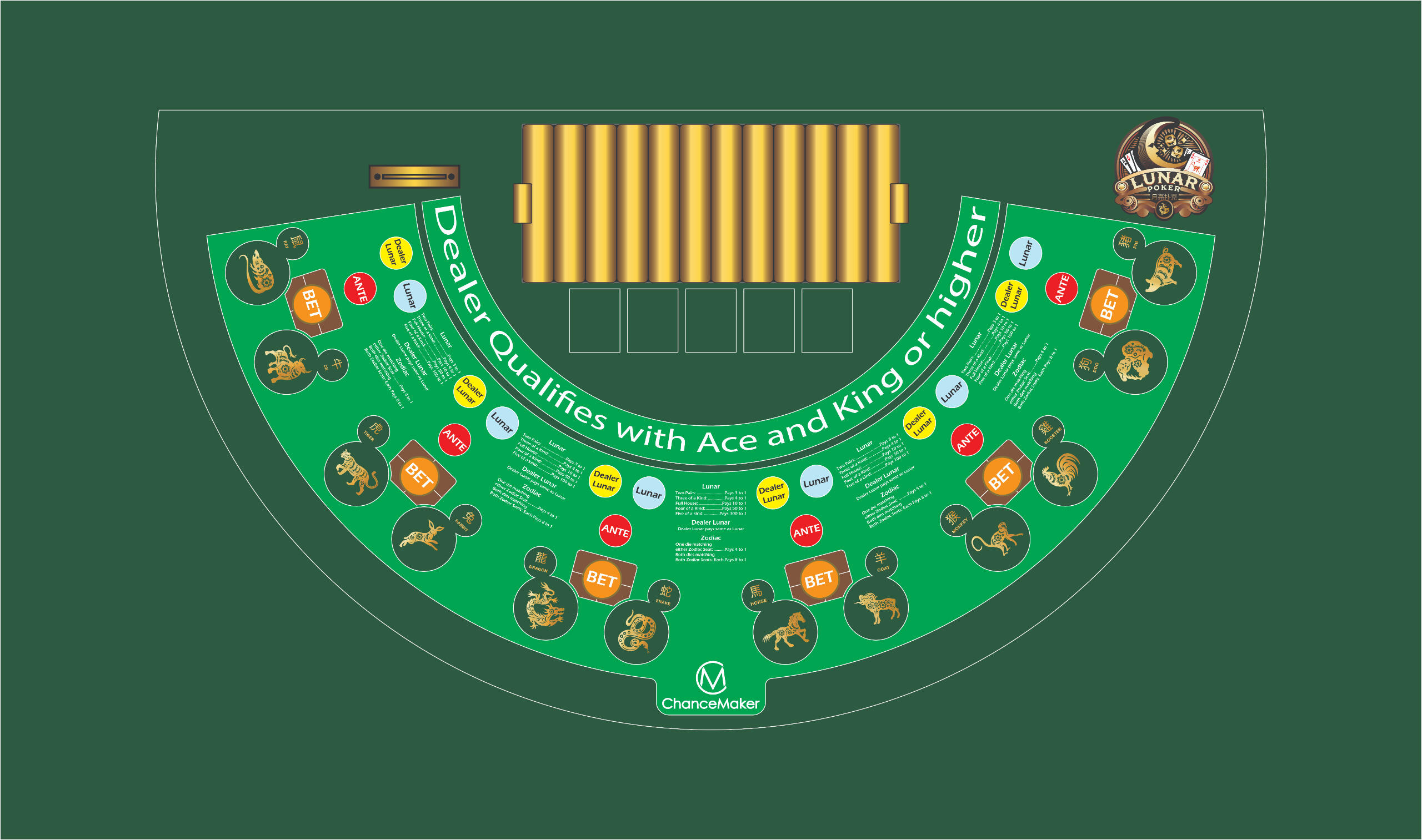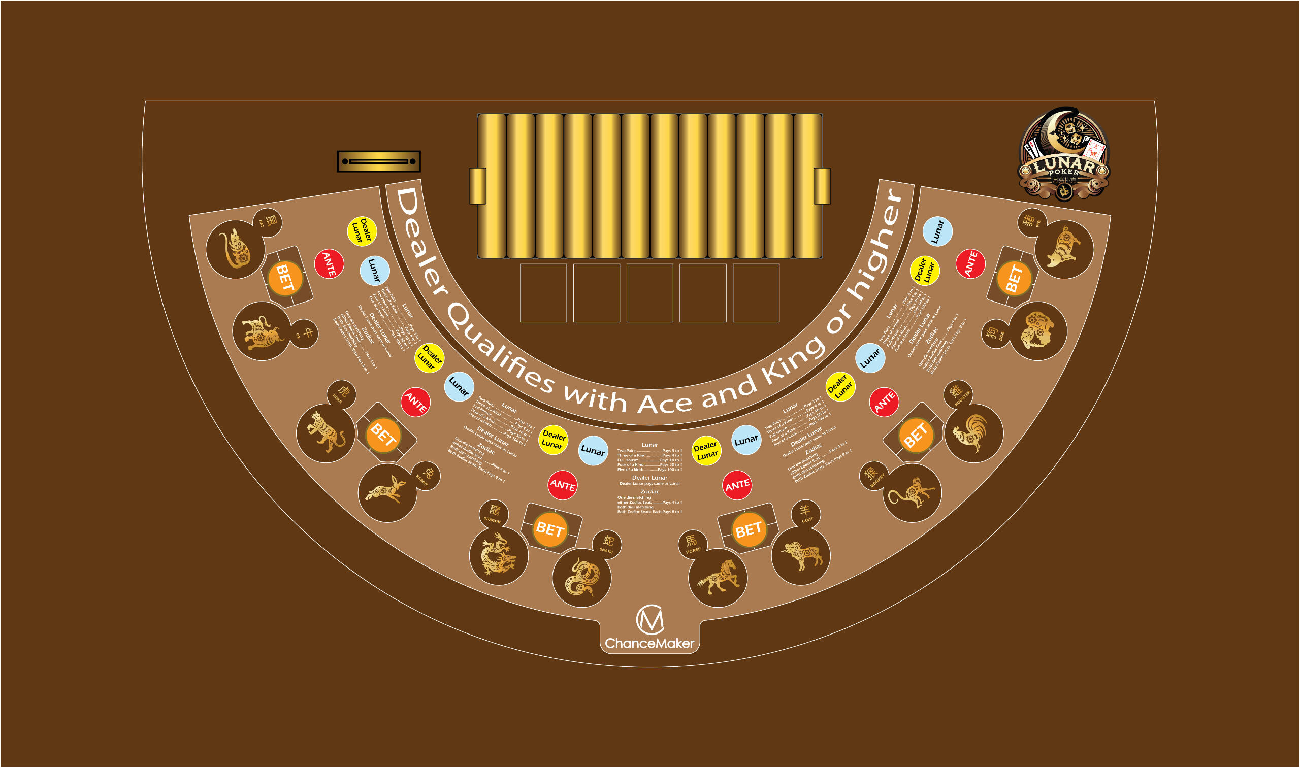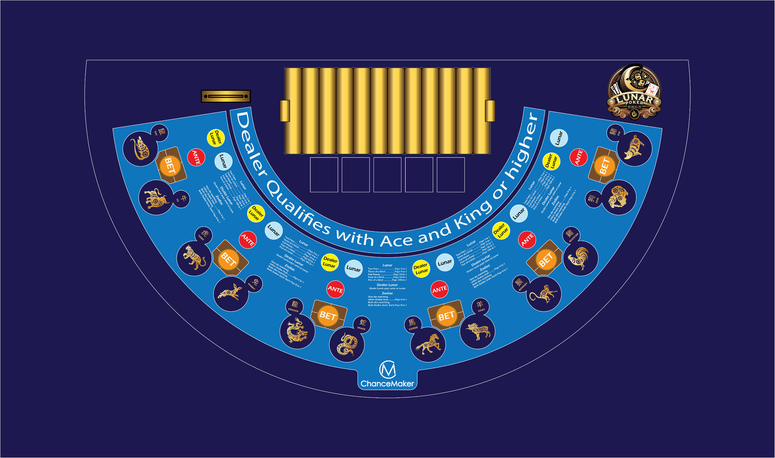 Lunar Poker features a premium table layout designed for a smooth and immersive gaming experience. The custom layout separates standard poker bets and Lunar side bets for clarity. Built with high-end materials, it enhances the look and feel of the game. This setup is ideal for both land-based and online casinos, ensuring seamless play.